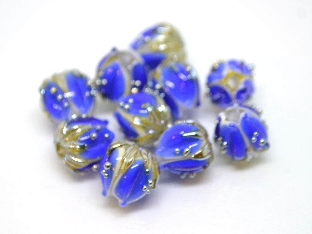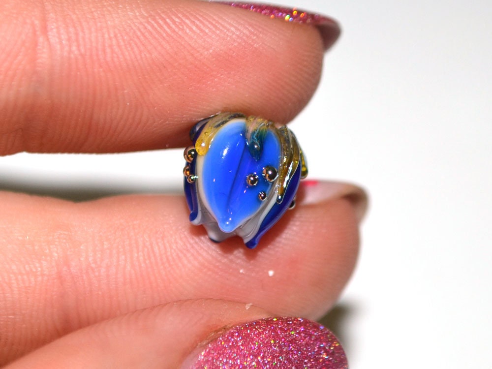 Dark blue bead with gold drops. The beads have 10mm in height. Handmade Lampwork flower bead are perfect for any jewelry making. Floral Lampwork beads look amazing. Cobalt blue beads are ideal for making a blue necklace. We make various Beads for crafts.