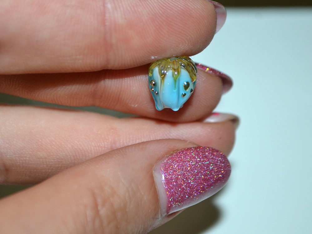 Lampwork glass flower beads have 10mm height. Light aquamarine flower buds with green gold leaves look so anazing and tender. Handmade lampwork light blue glass beads are perfect for jewelry making. Earrings with these tender aquamarine blue beads are best choice for your Wedding Something blue.