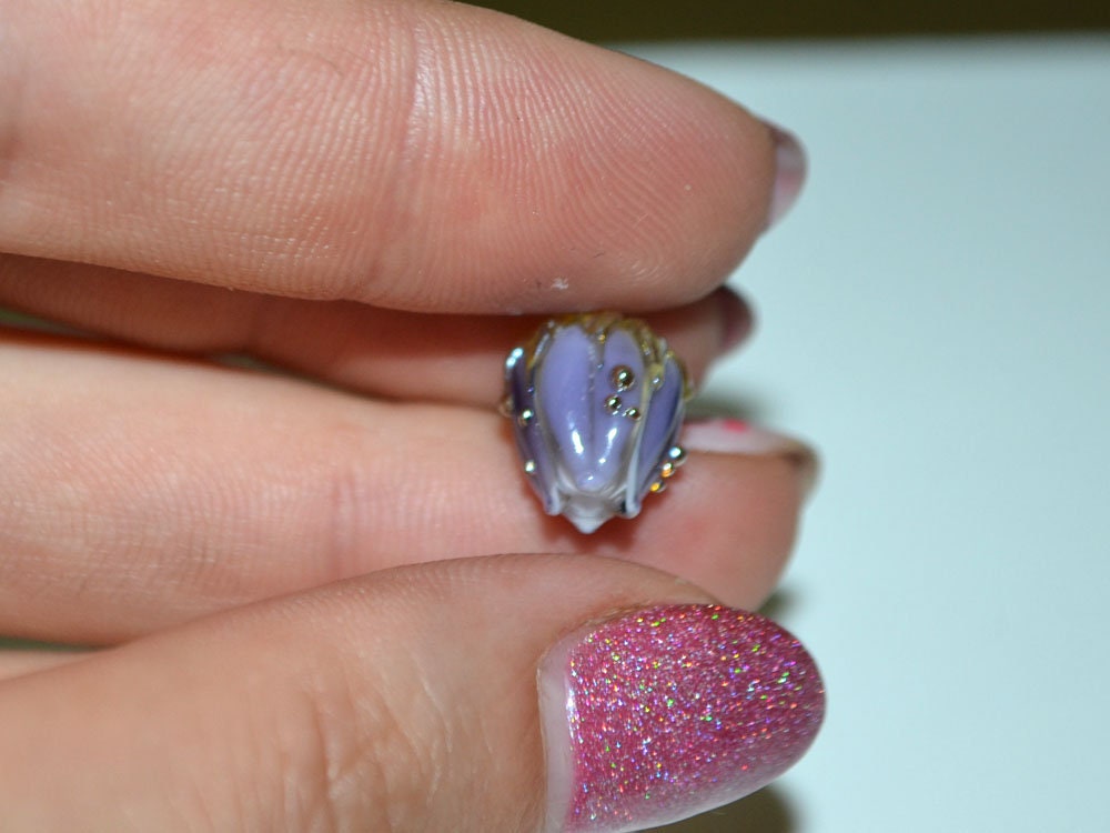 Lavender flower beads with green and gold. These 10mm beads look so cute and tender. Light purple flower beads are perfect for jewelry making. Artisan lampwork is amazing. These handmade flower beads are perfect for making a bracelet or earrings. Glass flower beads is popular motif in jewelry. Floral beads are amazing.