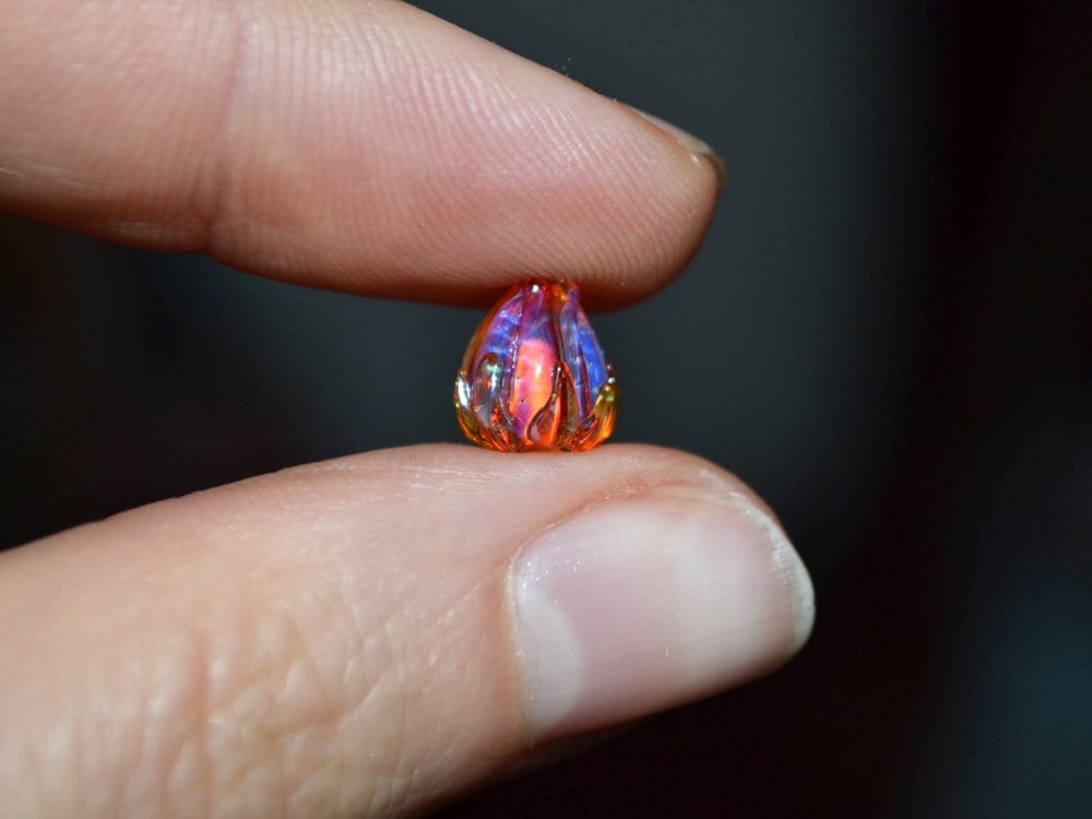 Orange silver flower beads are amazing. These 7mm glass beads are so small. The flower beads have a Netting pattern. Flower glass beads are great for making jewelry. You may use these Tiny glass beads for making cute earrings, necklaces or bracelets. Artisan lampwork is a great supply for any jewelry idea.