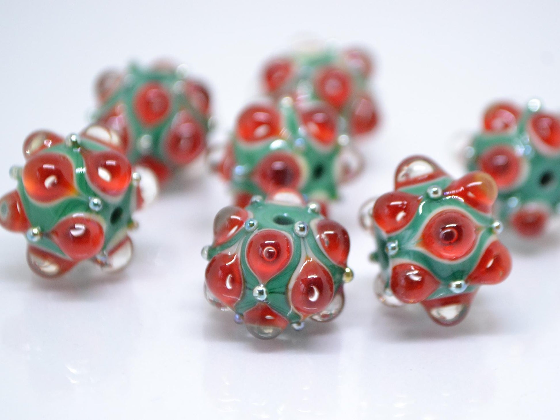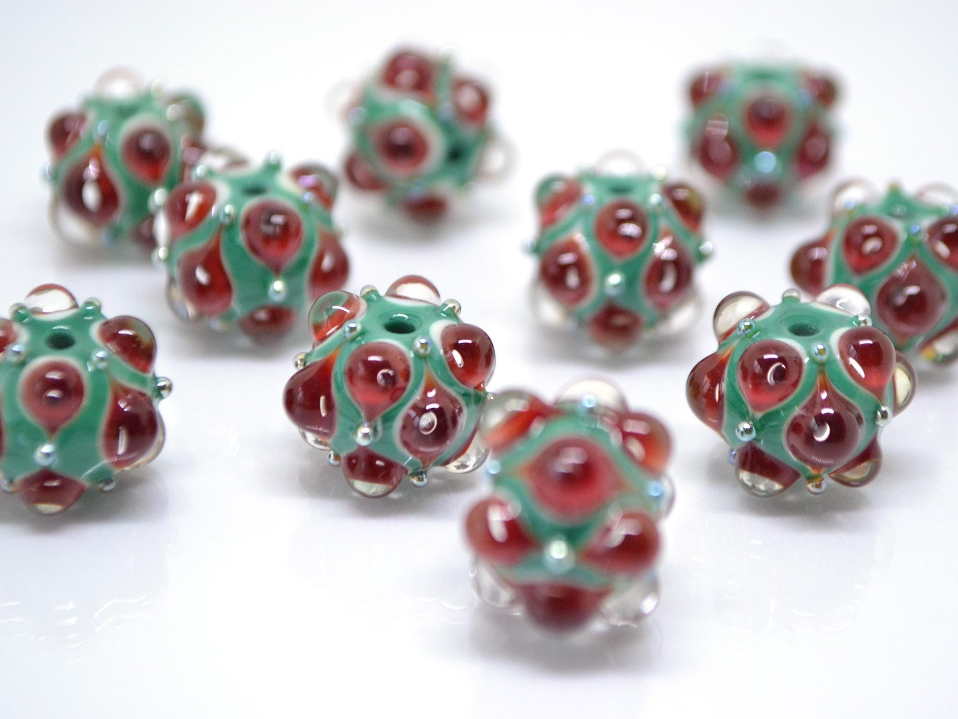 Add a touch of uniqueness to your jewelry designs with these Red Green Lampwork Beads. Each bead is carefully handcrafted with vibrant red dots on a base of elegant green glass, creating a dynamic and eye-catching pattern. These artisan lampwork beads are perfect for those who appreciate the beauty of handmade craftsmanship.